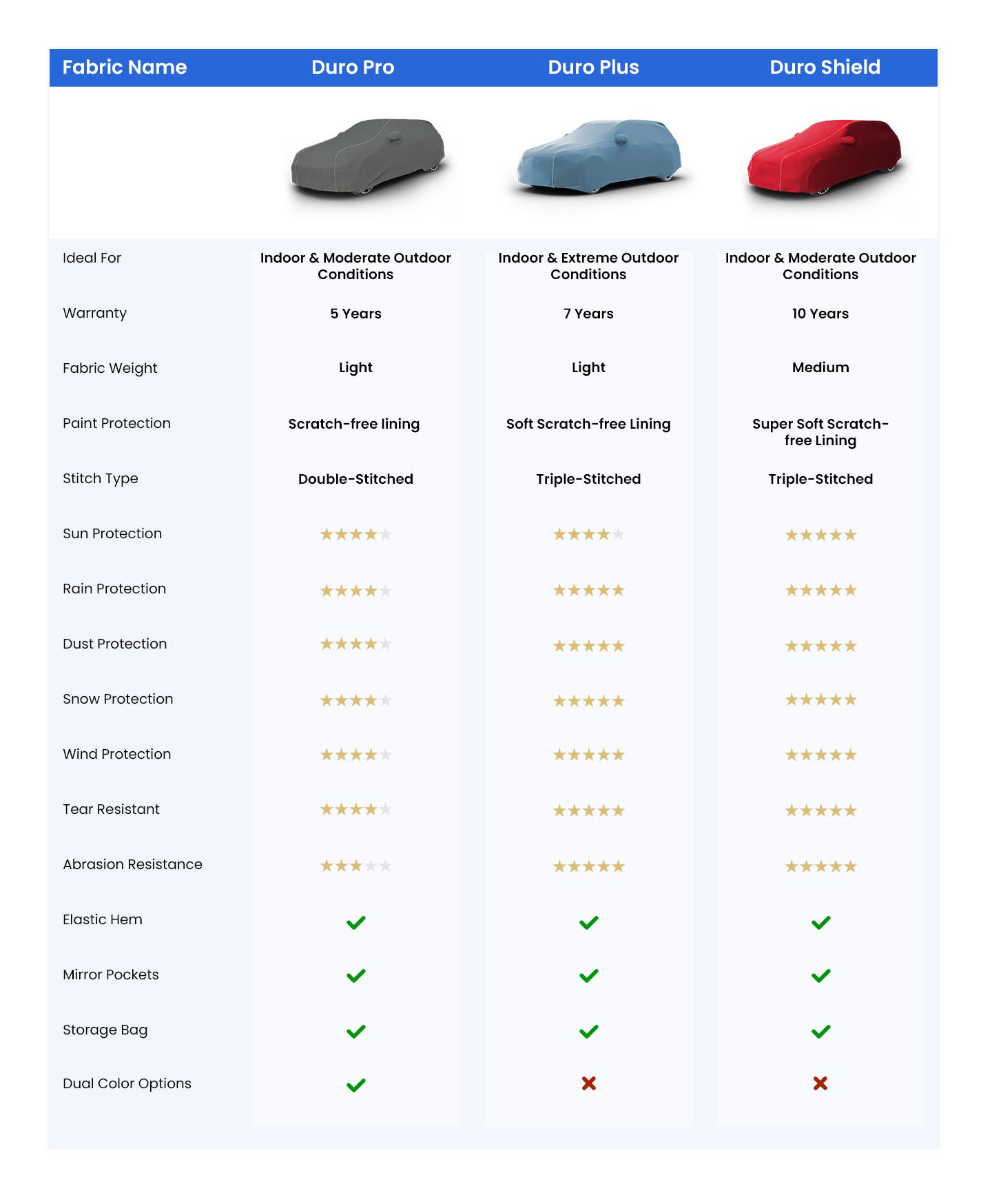 Your made-to-order car cover comes with a complimentary storage bag designed to fit the cover perfectly. Just fold, pack & store until you need it next, your cover’s storage bag will help you keep it sorted.